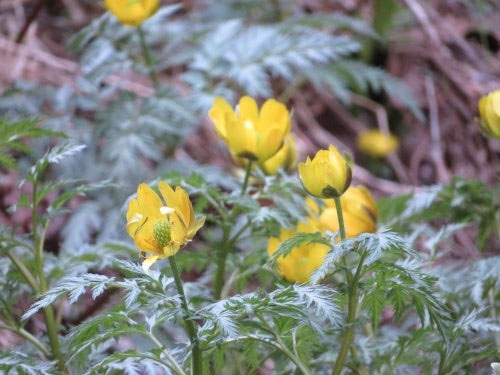 降りていくと、下から上へ見上げる斜面に、福寿草が咲いています。