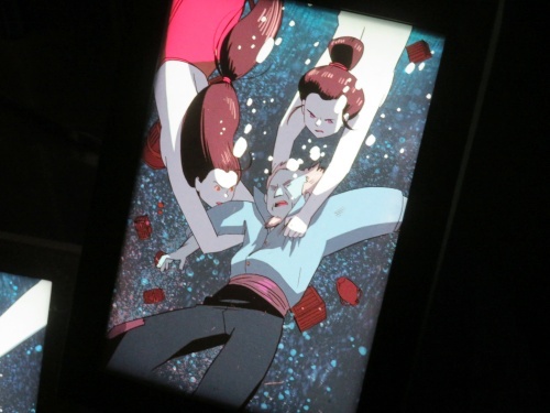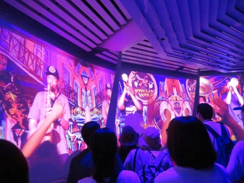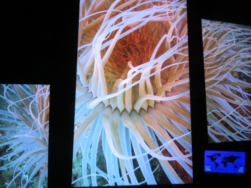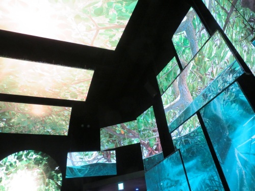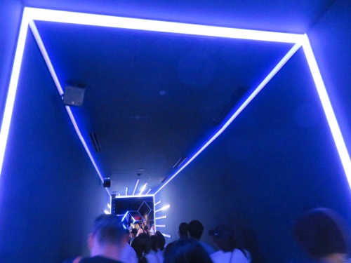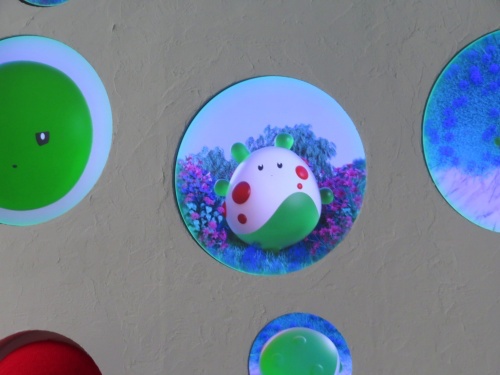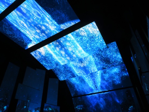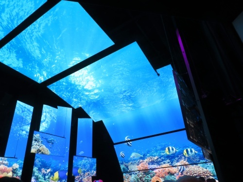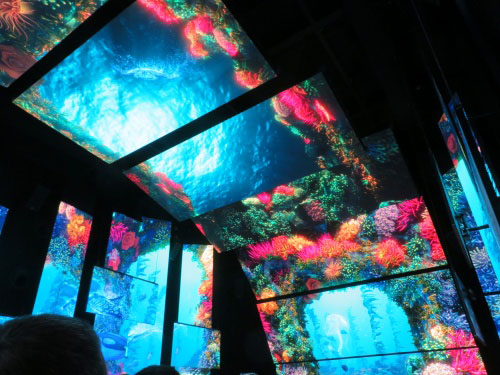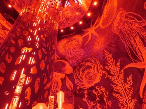 別の部屋に入ると、、海底のイメージでしょうか。赤や青でライトアップされた海の生物が壁一面に描かれていました。