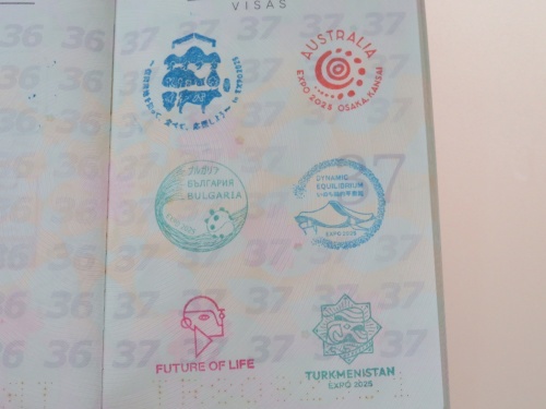 この日のスタンプは、左上から時計回りに、レストラン館にあった、オオサカKizaなイチバ、オーストラリア、ブルガリア、いのちの動的平衡館、いのちの未来、トルクメニスタンです。