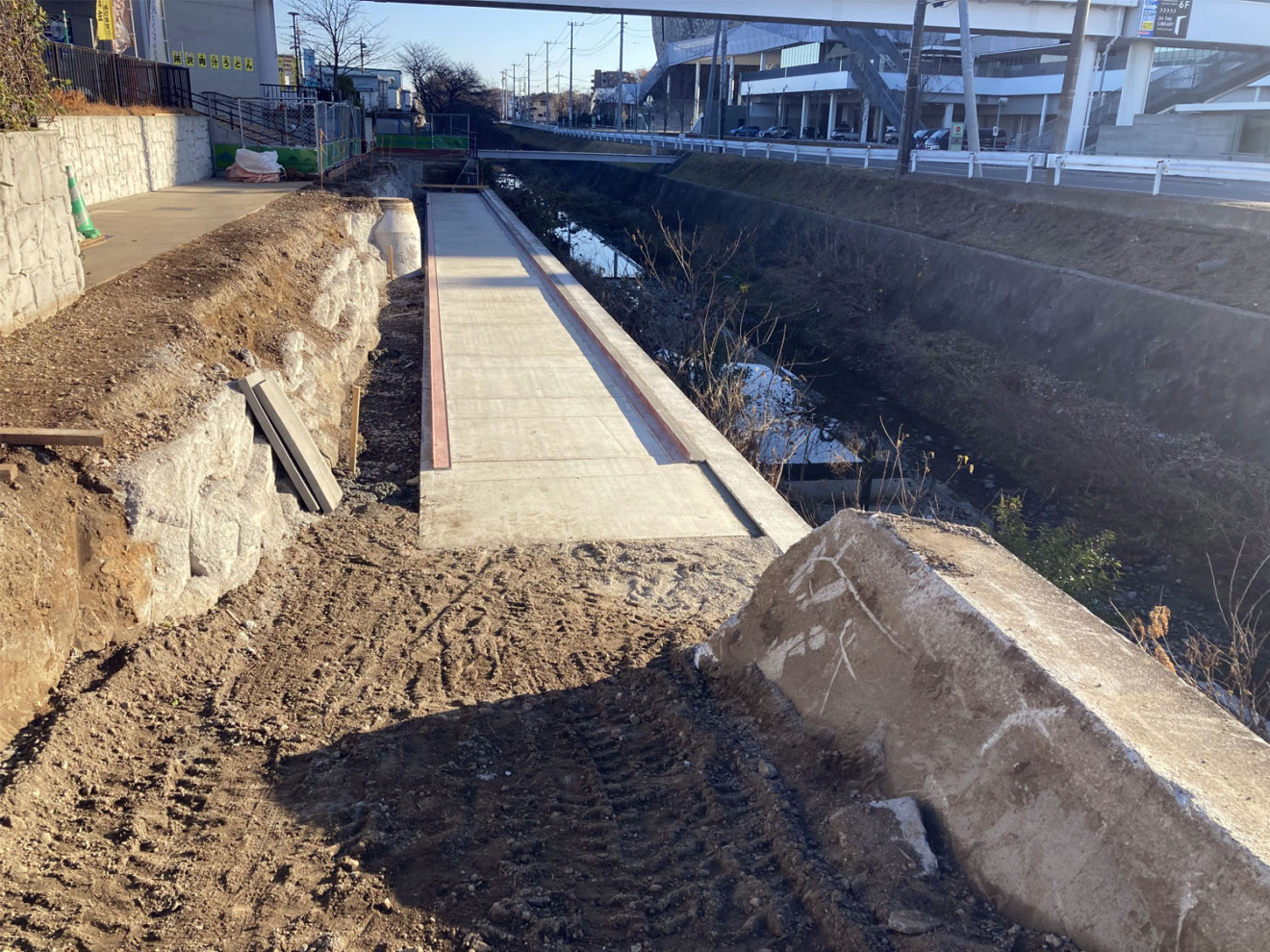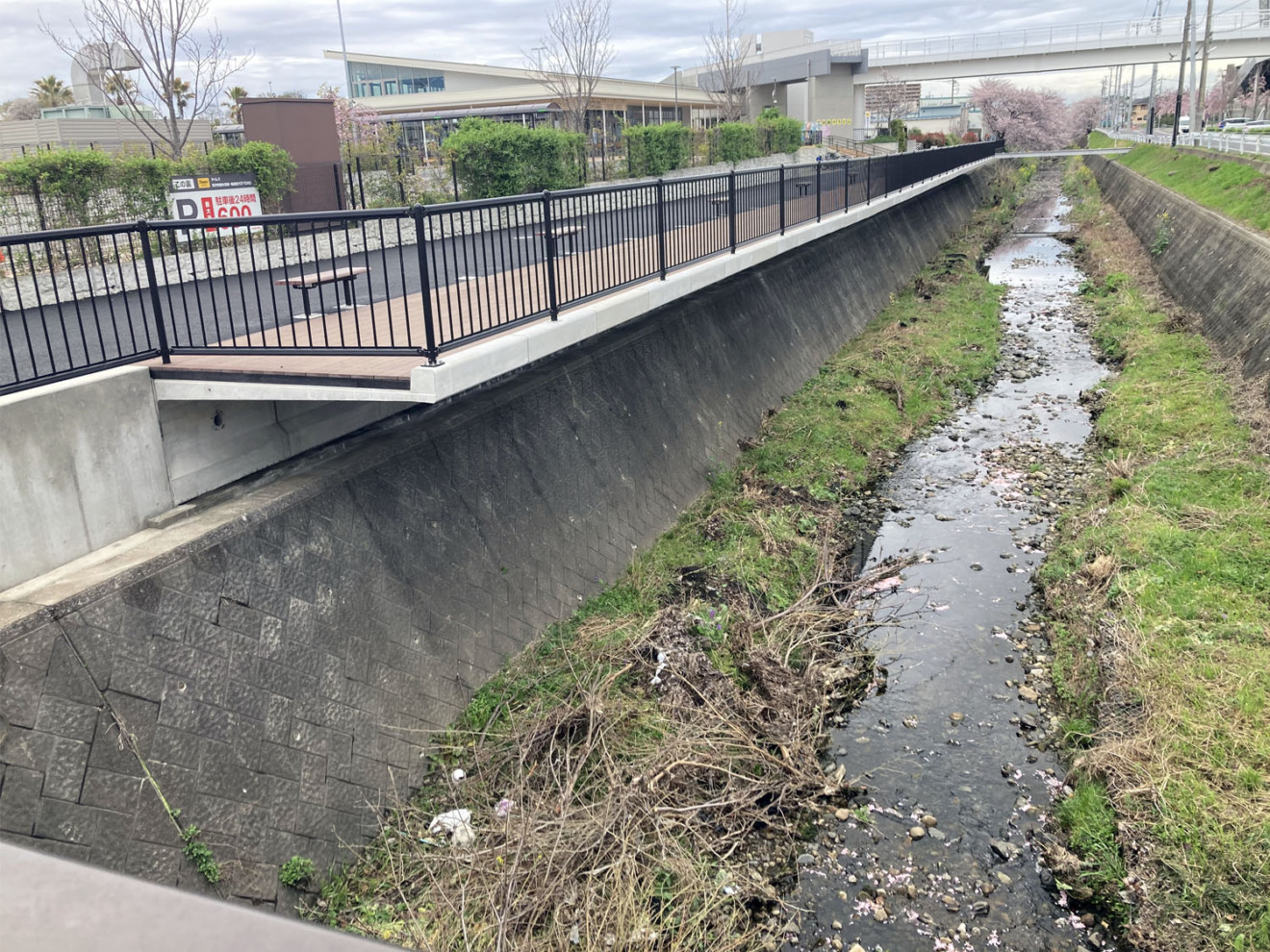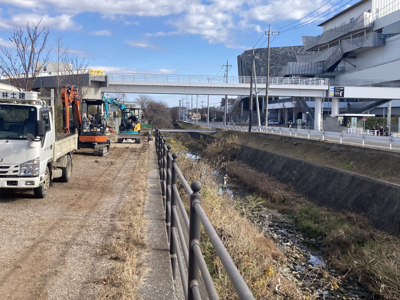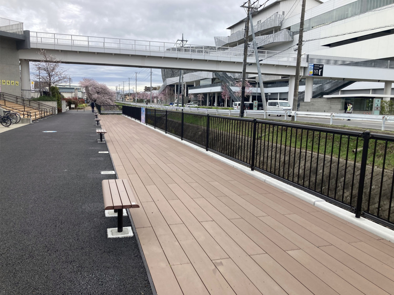 ところざわサクラタウンの川を挟んだ対面側の、所沢市観光情報・物産館YOT-TOKOから川沿いに出た個所の歩道を検討されていました。
