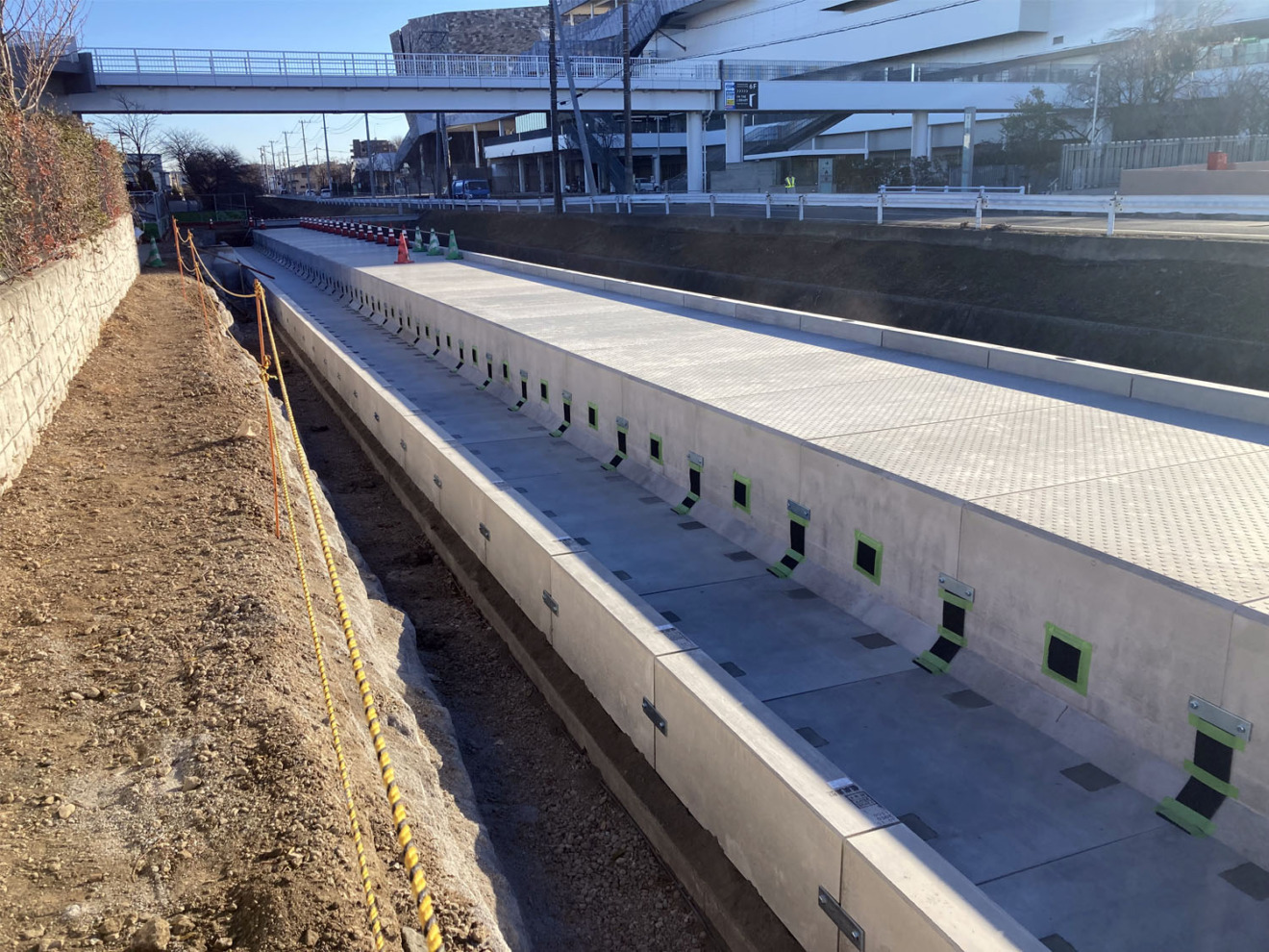市街地で大きな重機が入れないこともあり、どのように歩道を設置するか試行錯誤されていて、クレーンの設置場所が限られることが課題の現場でした。