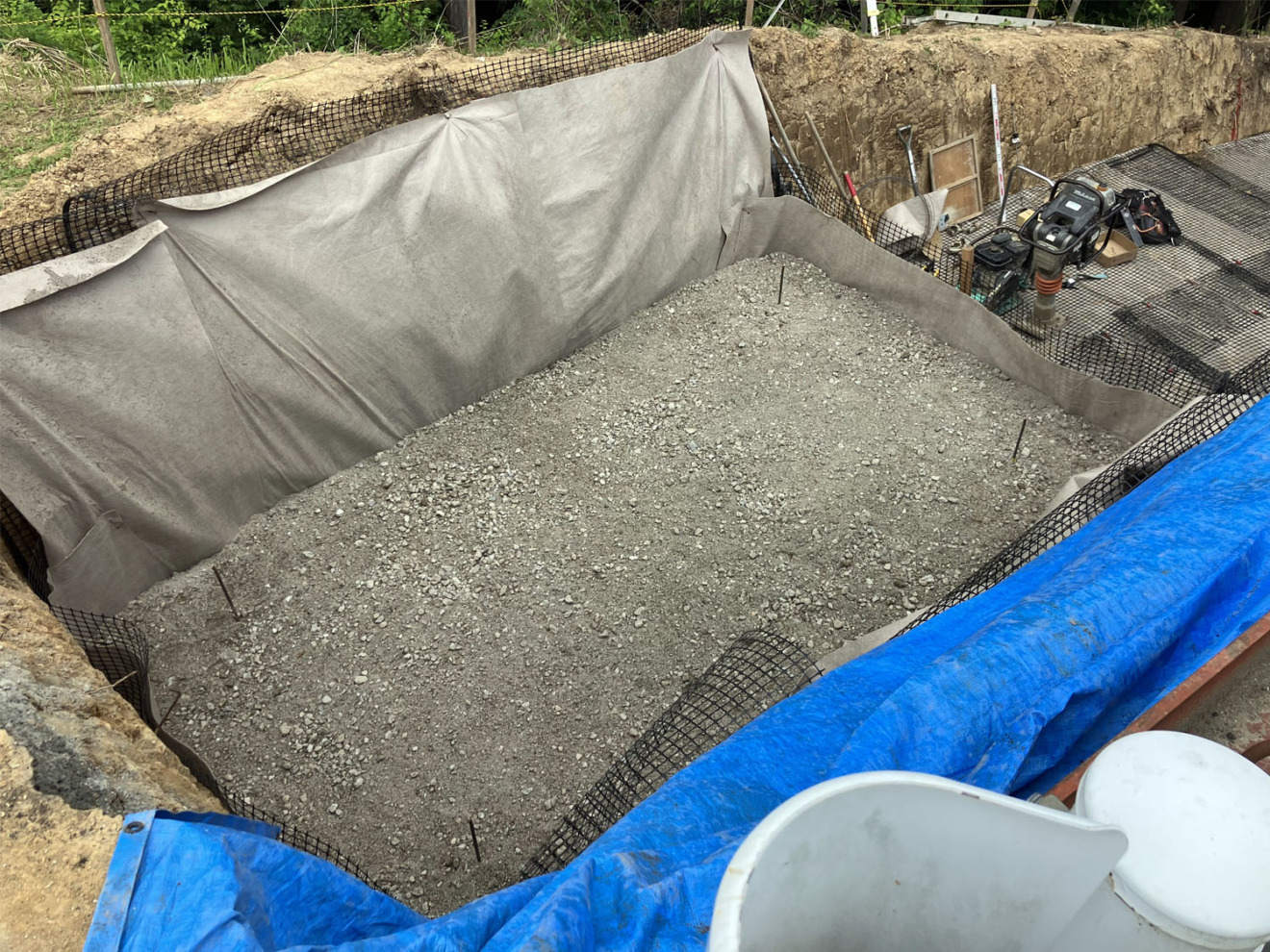 今回の現場は直接基礎では反力が足りず、テンサーマットレスによる地盤改良を行いました。