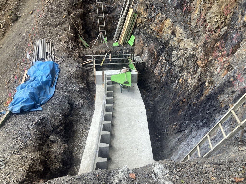 現場打ちは、基礎コンクリート、天端コンクリートの使用になりますので養生期間を少なくブロックを積んでいける工法になります。
