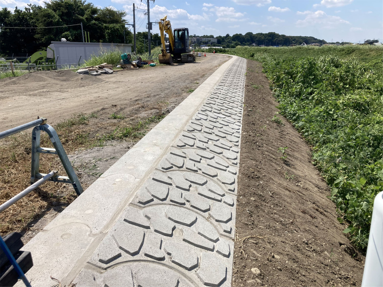 埼玉県和田吉野川の堤防舗装工事に際し、法肩保護と堤防天端付近の防草対策を兼ねて『ポラウェーブ(路肩用・法面用)』を設計採用いただき、堤防延長約1kmに設置していただきました。