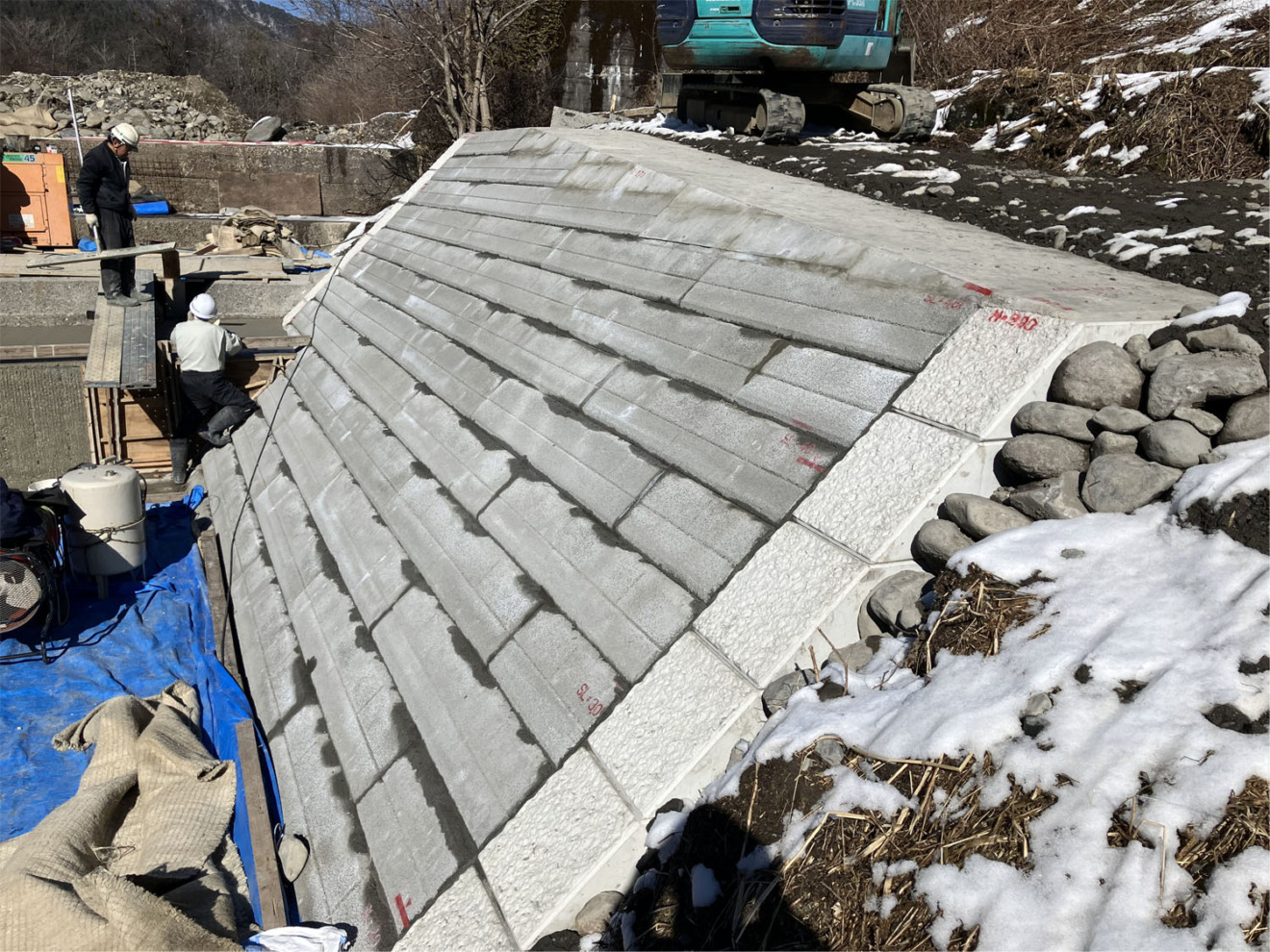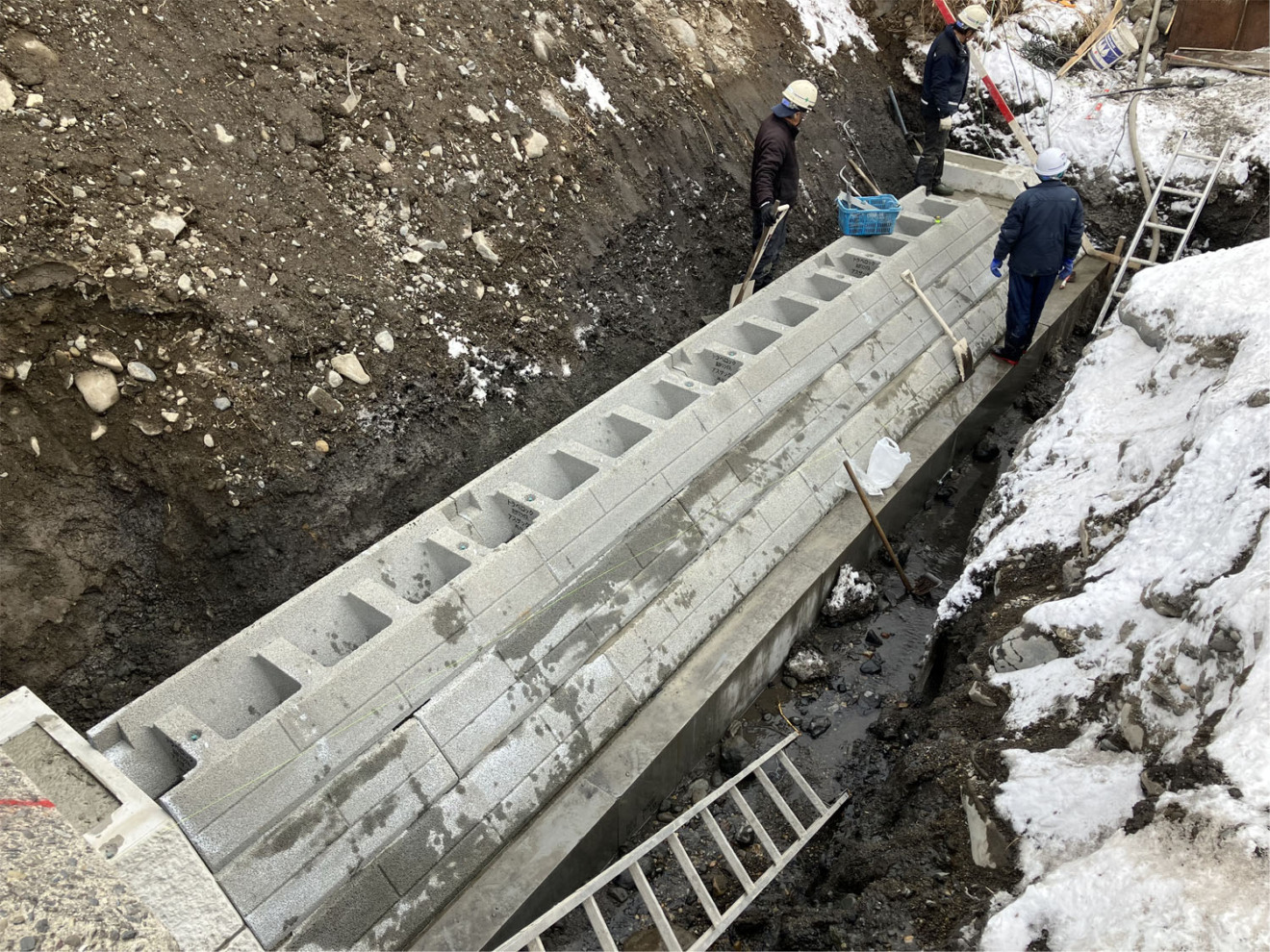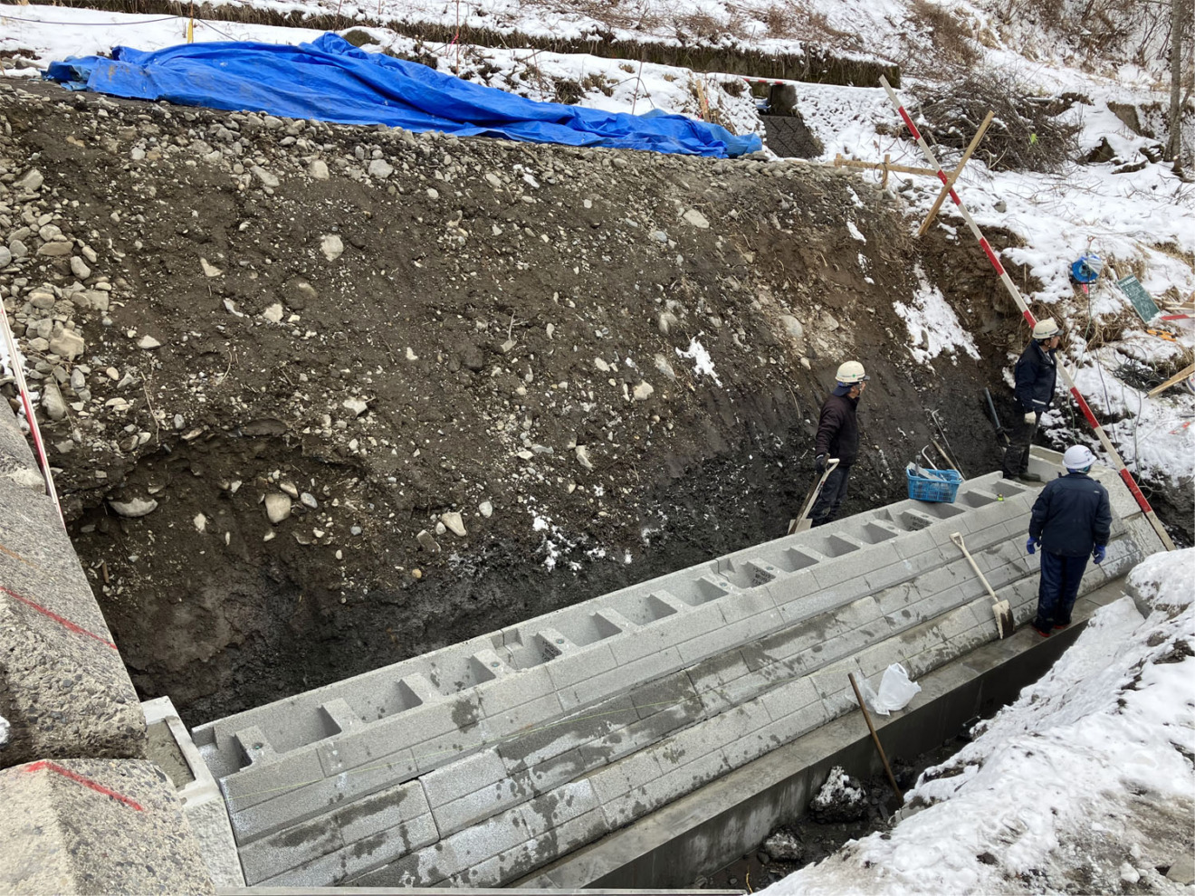 また、間知ブロックと比較して中詰コンクリートを少なくでき、バイコン製品のため凍害に強く、供給能力も高いという点もご採用いただいたポイントとなりました。