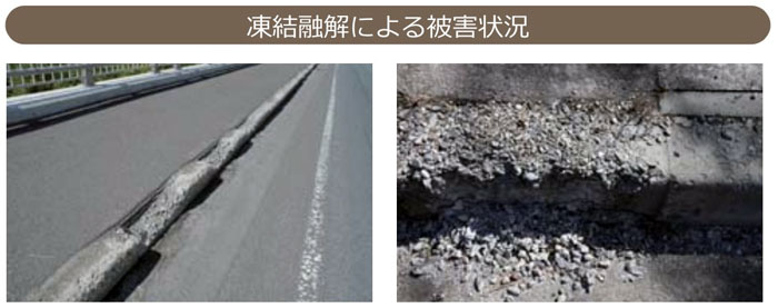 凍結融解の被害:寒冷地では、凍結防止剤(塩分)の散布により、コンクリート内の水分が凍結・融解を繰り返し、スケーリング(剥離・剥落)が発生します。